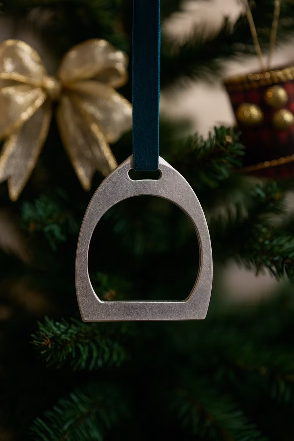 Hjort & Hjelms julgranshänge utformade som små stigbyglar är tillverkad med omsorg i Kalmar av aluminium.